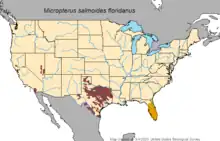 The Florida bass was thought to be restricted to Florida[3] but a phylogenomic study found that it was widespread in coastal river systems of the southeastern United States from Florida north to the Cape Fear River in North Carolina.[4] The Florida bass has been introduced to Nevada, alongside the largemouth bass, and into the range of the largemouth bass. Where the species mix the introgression of Florida bass genes can be very quick. Like the largemouth bass, Florida bass, can be found in a wide variety of waterbodies, it occurs in large lakes, rivers, and reservoirs, to smaller waterbodies such as swamps, ponds, and creek pools. Although this species may prosper in many aquatic environments, it tends to be most numerous in warm, densely vegetated eutrophic lakes, rivers and reservoirs. They are commonly found along shallow shorelines, but more frequently found around logs, rocks and beds of aquatic plants.[5]