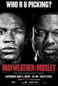 Floyd Mayweather Jr. vs. Shane Mosley, billed as Who R U Picking?, was a boxing welterweight non-title superfight, in which Mayweather Jr. won by unanimous decision with two judges scoring it 119–109 and one judge scoring it 118–110.[1] The bout was held on May 1, 2010, before a "sellout" crowd of 15,117 at the MGM Grand Garden Arena in Las Vegas, Nevada, United States.[2] Boxing greats Muhammad Ali and Mike Tyson were among a long list of celebrities in attendance.[2] The match was put together after Andre Berto pulled out of his scheduled January 30 unification bout against Mosley.