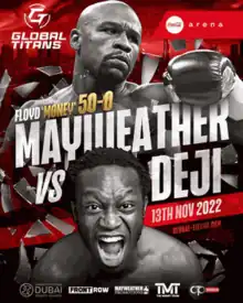 Floyd Mayweather Jr. vs Deji was an exhibition boxing match contested between former five-division world champion Floyd Mayweather Jr. and YouTuber Deji Olatunji. The exhibition boxing bout took place on November 13, 2022 at Coca-Cola Arena in Dubai, UAE. Mayweather defeated Deji via 6th round TKO.[2][3]