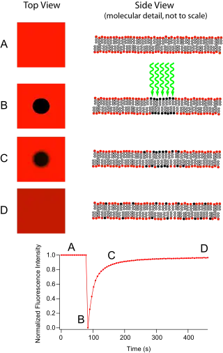 Originally, the FRAP technique was intended for use as a means to characterize the mobility of individual lipid molecules within a cell membrane.[1] While providing great utility in this role, current research leans more toward investigation of artificial lipid membranes. Supported by hydrophilic or hydrophobic substrates (to produce lipid bilayers or monolayers respectively) and incorporating membrane proteins, these biomimetic structures are potentially useful as analytical devices for determining the identity of unknown substances, understanding cellular transduction, and identifying ligand binding sites.