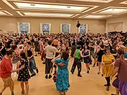 The festival includes a wide variety of traditional folk dance and music, as well as impromptu musical jam sessions, discussions, and craft sales. In recent years, it has featured more than 250 different sessions per year from Friday through Sunday of Presidents' Day weekend.[5] The festival is best known for its large contra dances, which can feature up to approximately 500 dancers dancing simultaneously on a custom-built dance floor in a hotel ballroom. Other dance offerings include swing, Latin, English country, square, clogging, hip-hop, cajun, zydeco, Irish, Scandinavian, Middle Eastern, Asian, and yoga.[4] The festival caters to all skill levels.[4]