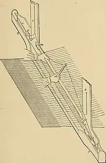 The history of this device is difficult to accurately ascertain due to poor recordings. Nonetheless, there are two general schools of thought around this; first those that believe that it appears to have been invented in the region of Languedoc of southern France (one year before its introduction in England), but was destroyed by state cloth inspectors of the rent-seeking Ancien Regime.[2] On the other side, are those that believe it simply originated where it was industrialized; England.
