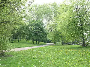 Folkestone Gardens is a man-made urban park on a plot of land that was formerly high-density housing. On 7 March 1945, the area was badly damaged by a V-2 rocket, resulting in the loss of over 50 lives.[1][2] In the late 1960s and early '70s, the area was cleared and the park was subsequently laid out over part of Folkestone Gardens and also Oareboro Road, an L-shaped street of terraced houses.[3]