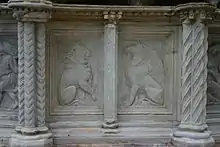 The lower basin is made up of 25 mirrors, each divided into 2 tiles that describe the 12 months of the year, each of which is related to a zodiac symbol. Each month is connected to scenes of daily life and the farming work that characterize it. As in other contemporary sculptures from Europe, in which the months are represented, here the manual work obtains dignity.[5] In this basin manual labour is in fact represented together with the arti liberali (liberal arts), with philosophy, with characters from the Bible and the history of Rome; in this specific order:[6]