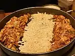 The National Intangible Heritage Centre and at the Hanok village in Jeonju the gastronomic capital of Korea, a festival is held every October promoting Jeonju's representative food, Bibimbap. Jeonju Bibimbap is usually topped with quality Jeonju soy bean sprouts, hwangpo-muk, gochujang, jeopjang, and seasoned raw beef and served with kongnamul-gukbap. The rice of Jeonju bibimbap is specially prepared by being cooked in beef shank broth for flavor and finished with shiteme oil for flavor and nutrients.[18] Many local cooks and public figures introduce their own unique variation of Bibimbap along with other local cuisines. Major programs include the gigantic Bibimbap made by all the participants- capable of feeding a 1000 people, a cooking contest for foreigners and an event called find Bibimbap.[19][20][9]
