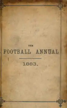 The Football Annual was a reference work published annually from 1868 to 1908. It reported on the various codes of football played in England, and also provided some coverage of the other home nations, supplemented on occasion by reports from around the world.[1] While association and rugby football provided its main focus, it also included some material on public school football, Sheffield football (until that code merged with association football in 1877), and, on occasion, even Australian and American football. A typical issue would include laws of the various codes, a summary of the preceding season, a listing of football clubs in England (including such details as each club's ground, secretary, and colours), and essays about aspects of the game.