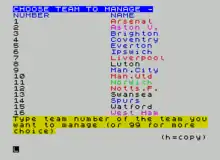 The game was written entirely in BASIC[1][2] and, apart from the match highlights on some versions, used only text displays and keyboard entry. The player chooses a team and then must try to earn promotion from the fourth to the first division (although the player can then keep playing for as many seasons as they wish). The player also competes in the FA Cup. Though the team and player names are real, they are not accurately represented, so whichever team is selected, the player always starts in the fourth division and their team is randomly populated with players. Each player has a skill rating and an energy rating. Players must be rested to renew their energy rating or they become injured. The players' skill and energy ratings also change at the end of the season. The team has ratings of defence, midfield and attack (the total skills of all defenders, midfielders or attackers selected), energy (an average of all selected players) and morale (which increases when the team wins and decreases when they lose). The player can select their team to balance the skills based on the opposing team's ratings (e.g. to increase the defence rating if the opposition has a high attack rating).