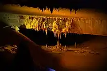 The cave descends several hundred feet below the surface, where an underground river, grottos, and chimneys can be found. The underground stream is supplied by a large underground lake located beneath English Mountain. The temperature inside the caverns remains at a near-constant 58 degrees and tends to stay the same year-round.[2]