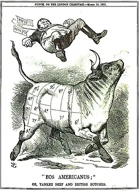 Several Deptford shipments arrived directly from the port of Kronstadt, in Russia, and were known to have been purchased in the cattle market of Saint Petersburg.[79] The Russian capital was more than 30° to the east of Deptford, and these animals may have come from much further still, since Saint Petersburg oblast raised few export-grade cattle. They may have been driven to market from south Russia.[80] In 1872 the Russian Empire was blacklisted for cattle plague and no more Russian cattle could be landed, even at Deptford.[79]