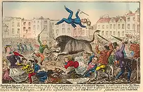 Demise of overcrowded Smithfield cattle market (satirical print, 1855: British Museum)