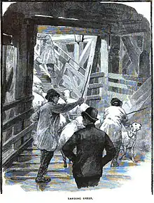 These men, who killed and butchered the animals, worked in gangs of four,[58] and earned very high wages for the era: £5 (≅ £6502018) a week was not uncommon. No slaughtering was done on Saturdays; on other days it varied according to demand, and for a rush order might last up to 20 hours on end. The work was said to be brutalising "and conducive to drink".[49]