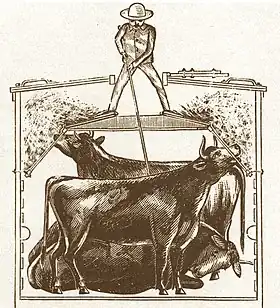 181. "It consisted of a heavy handle, nearly six feet long, with a sharp iron or steel spike extending from one end a half-inch or more. This was used to prod the other animals in the car aside, while a "down steer" could be encouraged by the sharp point to take his place in the ranks. The prod pole was also equipped with a flat-headed screw, driven into it near the "business" end, and extending out a short distance at right angles from the pole. When the "down steer" refused to respond to numerous jabs and such language as was on those occasions, the end of the pole with the attached screw was engaged with the matted end of his tail, and by sundry twists, turns or pulls on the pole a severe strain was applied to that sensitive appendage. If the prostrate steer had life or strength enough left in him to rise, this treatment would bring about the desired results; if he continued in an indifferent attitude, he was considered in a bad way, and a dead steer when the market was reached": Clemen 1923, pp. 196–7.