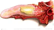 Cattle plague: post mortem drawing of tongue and throat, 1865 (an early instance of colour printing)