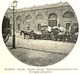 For centuries the main cattle market for London had been held at Smithfield. There being no refrigeration, butchers bought an animal at the market, and slaughtered it themselves. The site was small and by the Victorian era the volume of trade had increased to the point that it was badly overcrowded and a public health nuisance.[1][2] Driving cattle to Smithfield through the thoroughfares of the metropolis e.g. Oxford Street[1] was bad for traffic congestion and endangered life and limb.[3]