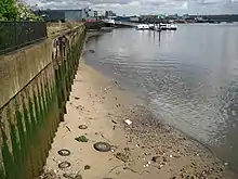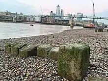 The foreshore of the River Thames in London, England, is the area of the riverbed revealed at low tide, and includes sections known as Tower Beach, Bermondsey Beach, and Folly House Beach, in Canary Wharf.[1] These are tidal beaches that are covered by the water of the river at high tide.[2]