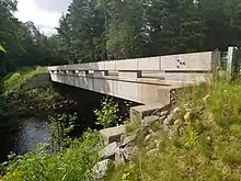 The main span of the Forest Route 157–Tamarack River Bridge was 50 feet (15 m) long and 19 feet (5.8 m) wide, with a roadway width of 17 feet (5.2 m).[2] The bridge represented a standard 1915–16 Michigan State Highway Department design. The bridge consisted of two concrete girders resting on concrete abutments with angled wingwalls. The bridge was modestly detailed, with recessed rectangular panels on the outside walls and bronze "Trunk Line Bridge" plates (since removed) on the girders' inside walls.[2]