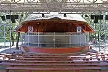 At the edge of the Forest of Bojčin, a summer theater was built in 2010, designed by architect Zdravko Milinković. The stage is covered with thick reeds, with a scenic diameter of 16 meters. Apart from the stage, there are two dressing rooms and a covered amphitheater auditorium for 1,000 visitors.[9] Directly behind the stage, an art colony was built in the same year, consisting of six wooden houses at a distance of about twenty meters. Each house has a room of 12 m2, bathroom and a terrace of 10 m2, and the space is air conditioned.[10] Next to the stage, there is an ethno restaurant "Bojčinska koleba", a catering facility consisting of typical Srem houses for pigs, covered with reeds. Folds with mangalitsas are located in the vicinity of the restaurant.
