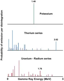 Each of these elements emits gamma-rays with distinctive energy. Figure 1 shows the energies of emitted gamma-ray from the three main isotopes. Potassium 40 decays directly to stable argon 40 with the emission of 1.46 MeV gamma-ray. Uranium 238 and thorium 232 decay sequentially through a long sequence of various isotopes until a final stable isotope. The spectrum of the gamma-rays emitted by these two isotopes consists of gamma-ray of many different energies and form a complete spectra. The peak of thorium series can be found at 2.62 MeV and the Uranium series at 1.76 MeV.