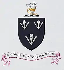 The family motto, "In corda inimicorum regis", is likely taken from the Latin Vulgate's rendering of Psalm 45:5, and means "in the hearts of the king's enemies." In modern translation, the full verse is: "Let your sharp arrows pierce the hearts of the king's enemies; let the nations fall beneath your feet" (New International Version).[4]