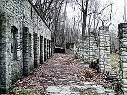 The Old Fort Belle Fontaine Cemetery was established in 1809, when then Lieutenant Colonel Daniel Bissell moved the original Fort Belle Fontaine encampment to a new location. The cemetery was located about 100 yards or so southwest from the Cantonment buildings, which during the period of 1805 to 1826 had interments of at least 30–40 military officers, and about 100 enlisted soldiers.[3] The location was confirmed to be along the bluffs on the south bank of the Missouri River about a hundred yards southeast along the bluff past the old abandoned block house, when W.T. Norton visited the site in 1911. At that time the old cemetery on the bluff was strewn with rocks and mortar, the debris of old tombs. All the tombs were in a more or less ruinous condition. The tombs were built of masonry, about two feet above the ground, and upon them rested the memorial tables. Most of the inscriptions were illegible.[4] In 1904, newspaper stories, most notably in The St. Louis Republic, recorded the recovery and moving of 33 burials with headstones to the newly established Jefferson Barracks National Cemetery. Therefore a considerable number of unmarked burials still remain at the now decertified cemetery. The article in The St. Louis Republic included rough photos and drawings of the site.[5] This old cemetery is not related to the Bellefontaine Cemetery established in 1849 on the road leading to Fort Belle Fontaine, and initially called the Rural Cemetery.[6]