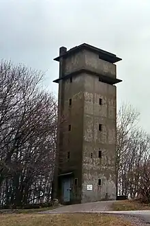 During World War II Fort Foster's heavy guns were superseded by a new 16-inch (406 mm) gun battery at Fort Dearborn. The 10-inch guns of Battery Bohlen were scrapped in 1942. However, new construction also took place at Fort Foster as part of the general improvement of US coast defenses that began in 1940. In 1940-1944 the Harbor Defenses of Portsmouth were garrisoned by the 22nd Coast Artillery Regiment. A new mine control station and mine casemate were built near the former 10-inch battery, along with two new gun batteries at a different location.[3] Battery 205, begun in 1942, was to have two 6-inch (152 mm) M1 guns on shielded barbette carriages with a bunker for ammunition and fire control, but construction was suspended in 1944 and the battery was never armed. A six-story fire control tower was constructed to spot targets for this battery.[3] Anti-Motor Torpedo Boat Battery (AMTB) 952 was also built at Fort Foster in 1943, with an authorized strength of two fixed 90 mm guns and two towed 90 mm guns.[4]