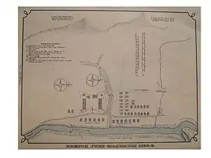 In 1753, Governor Jean de Lauson ordered construction of a fortified trading post at the confluence of the Allegheny River and French Creek at Venango, a Lenape village.[1] That year, the French expelled English traders from Venango, and Captain Philippe-Thomas Chabert de Joncaire established Fort d'Anjou with a permanent garrison at the location.[1] This was one of four forts intended to protect French access to waterways connecting the Great Lakes and Ohio River, and ultimately the Mississippi River; they had colonies in each region.