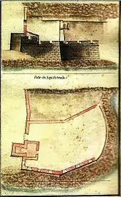 In the reports of Manoel Correa Branco (1776), the fort is "...the last situated in the bay, and the main one defending [the bay] crossing fire with the many forts that defend the bay", noting the need for its repairs, including grout in the guardhouse, garrison cots, the wooden ceiling, and the roof of the small house that served as a powder magazine, which lacks door and stored the artillery during the winter.[5] At this time, the fort had an irregular polygonal plan, with the walls protected by six cannon emplacements towards the sea and one towards the town.