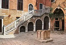 Returning home to his palace and hearing the woman's cries, her uncle, Doge Marino, reached the Campiello, placing himself between the noble Fosco Loredan and his niece Elena Grimani. A presence that would have petrified any man but not the angry and very jealous Fosco who, after having explained the reasons for his fury, which would have resulted from the close acquaintances of his wife Elena with one of her cousins of the Mocenigo family, and having received from the Doge the imperious order to sheathe the sword he had drawn to strike his wife, he pretended to acquiesce to reason. But, waiting for the Doge to put his blade in the sheath too, after he had used it to protect the unfortunate Elena and give more strength to his command, Fosco yelled at the Doge to watch his back because armed men were approaching, distracting him from those few moments needed to deal a precise blow of the blade that cut off the head of the unfortunate Elena. It was that gesture that exhausted the violence of the murderous mind of Fosco who, immediately after, throwing himself on the dismembered corpse of his wife, began to invoke the Doge's pity. The Doge, recovering from the ferocious surprise, was about to execute on the spot Fosco Loredan, who, as a noble equal of him, asked for forgiveness in the name of a norm in use by the nobles at the time, which justified the betrayed husband who executed his wife for infidelity - a request that the astonished Doge Marino Grimani nevertheless denied. At that point, with his authority he condemned the man to go to Rome to ask for the Pope's grace, as His Holiness was the only one who could have granted it to a noble of the rank of Loredan.[3] At the same time, in that obscure Campiello del Remèr which overlooks and closes on the Grand Canal, he ordered her bloodthirsty husband to pick up the severed body and load it on his shoulders while, with the guilty hand, pick up the head of the beautiful Elena and walk to Rome to submit to the judgment of the Pope who would have to see him in this way. Fosco left for the Eternal City but, having arrived there, still with his clothes and limbs stained with the blood of the body that he had been forced to carry on his shoulders, clutching his wife's head between his hands, he was not even admitted to the sight of Pope Clement VIII who, having heard the story, categorically refused to meet him and grant him forgiveness. Following the Pope's refusal, Fosco escaped from the guards who were taking him to prison and went back to the Campiello del Remèr. Arriving there, out of desperation he threw himself into the Grand Canal, letting himself drown just a few steps from the shore.[4]