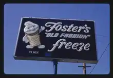 George Foster moved to California after World War II to open outlets for Dairy Queen, since he owned the development rights in the state. However, state laws protecting the dairy industry prevented the use of “dairy” in restaurant names. So instead, in 1946, Foster opened a restaurant named after himself, Foster’s Old Fashion Freeze.[7] (The apostrophe was later dropped.)[8] In 1951, he sold the chain's 360 locations for $1 million. By 1987, it had been reduced to 189 locations.[9]