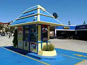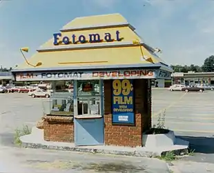 Fotomat was an American retail chain of photo development drive-through kiosks located primarily in shopping center parking lots. Fotomat Corporation was founded by Preston Fleet in San Diego, California, in the 1960s, with the first kiosk opening in Point Loma, California, in 1965. Fotomat became a public company in 1971 and was listed on the New York Stock Exchange (NYSE) in 1977.[1] At its peak around 1980, there were over 4,000 Fotomats throughout the United States, primarily in suburban areas. Fotomats were distinctive for their pyramid-shaped gold-colored roofs and signs with blue and red lettering. Usually positioned in a large parking area such as a supermarket or strip mall, the Fotomat huts required a minimal amount of land and were able to accommodate cars driving up to drop off or pick up film.[2] Fotomat sold Kodak and Fotomat brand film, as well as other photography-related products, and offered overnight photo finishing. Many people assumed Fotomat was owned by Kodak, because of the yellow roofs and font similar to Kodak packaging. Fotomat also made filmstrips (35mm single frame) for school, when teachers wanted to have a custom captioned or sound filmstrip made, the Teacher could use the Fotomat filmstrip development service, but teachers would have to take the pictures on blank 35mm single frame film and record the soundtrack on a cassette tape, then they would take them to the Fotomat booth, and the film and cassette tape would be sent to the Fotomat Lab to be produced.