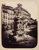 It was torn down by 1880, and some of its parts were stored.[4] In 1911, it was reconstructed by Ángel García in the Parque del Oeste, where it endured damage during the 1936–1939 Civil War.[5] The fountain ended up in 1941 in a somewhat dull open space near the Museum of Municipal History,[6][7] close to another Ribera's work, the Baroque frontispiece of the museum.[4] As the fountain suffered several vandalic attacks, the surrounding space was enclosed by a fence in 1999.[7]