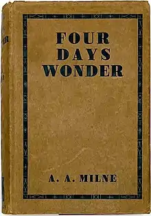 Four Days Wonder is a 1933 comedy novel by the British writer A.A. Milne.[1] Jenny, the heroine of the story, is an 18 year old orphan, who spends her life daydreaming. Her mind is occupied with an imaginary conversation when she absent-mindedly walks into her old home, now let to a respectable, middle-aged couple. Jenny finds, on the floor, the body of her long-lost Aunt Jane, and suddenly realises that she is in the wrong place at the wrong time.