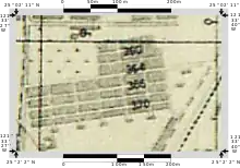 The site of Four Four West Village (四四西村), as appearing on a U.S. Taiwan Defense Command map dated presumably around 1960, indicated by roughly thirty-three darker-coloured plots in the center.