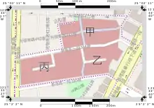 A 2017 map of the residential area Zhongtuo (in red) in Taipei, with an indication of its three zones (namely 甲, 乙 and 丙).