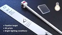 The Four Prism Dioptre Reflex Test (also known as the 4 PRT, or 4 Prism Dioptre Base-out Test) is an objective, non-dissociative test used to prove the alignment of both eyes (i.e. the presence of binocular single vision) by assessing motor fusion.[1] Through the use of a 4 dioptre base out prism, diplopia is induced which is the driving force for the eyes to change fixation and therefore re-gain bifoveal fixation meaning, they overcome that amount of power.