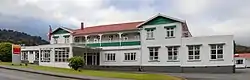 The hotel was built in 1928, at a cost of approximately £20,000, and was officially opened on 20 December 1928.[1][2][3] Although a two-storey building, the hotel was described as have a bungalow style,[3] owing to the generous upper-floor verandahs. The hotel was built with 40 bedrooms, designed to accommodate up to 100 guests, as well as four parlours and a large dining room for up to 70 diners. The building measured 30 metres (100 ft) by 15 metres (50 ft), with a height of 11.6 metres (38 ft), and was constructed of heart rimu timber framing and weatherboards on a concrete foundation, with a corrugated steel roof. A large portico at the main entrance provided shelter for arriving and departing guests.[1][3] Upholstery for the hotel was completed by Caliari and O'Connell of Hokitika, while the tiling, mantling and furnishing were completed by James Duncan Jr, assisted locally by Robert Emmett Clarke.[3]