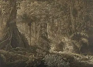 Highly talented at drawing, he accompanied the diplomatic mission of the Duke of Luxemburg, extraordinary ambassador to king Louis XVIII, to Brazil.[1] On the shores of the Paraîbo do Sul, in the woods of Rio Bonito to the north of Rio de Janeiro, he made several signed croquis, and once he was back in Europe worked them up into a large watercolour of the untouched and primitive forest interior of Brazil.[1] The resulting work (also the result of minute study of tropical plants cultivated in the greenhouses of prince Maximilien zu Wied's château), Forêt vierge du Brésil, was shown at the Salon of 1819. From its vegetal profusion emanates an organic luxuriance which several photographers later tried to emulate and reproduce.