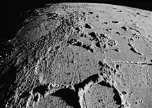 Fra Mauro is the worn remnant of a walled lunar plain. It is part of the surrounding Fra Mauro formation, being located to the northeast of Mare Cognitum and southeast of Mare Insularum. Attached to the southern rim are the co-joined craters Bonpland and Parry, which intrude into the formation forming inward-bulging walls. The crater is named after Italian geographer Fra Mauro.[1]