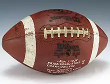 A football signed by the 1975 Framingham State Rams football team after defeating Curry College, 16–8