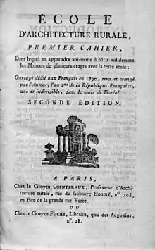 • Architecture périodique, ou notice des travaux et approvisionnemens que chacun peut faire, a peu de frais, chaque mois et chaque année, soit pour améliorer ses fonds, soit pour construire toutes sortes de batisses, soit pour multiplier les engrais (PDF). Paris: Bureau de l'école d'architecture rurale. 1792. Retrieved 13 February 2019.