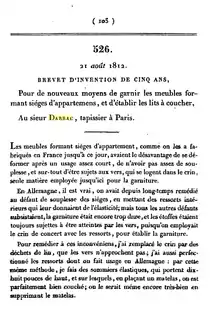 Darrac was also an inventor. In August 1812, he was granted a patent (Brevet d'invention) for five years[2] for his new methods for upholstering furniture and his new method of producing a bed base.