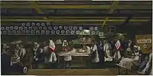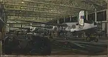 At the start of the Second World War, Macdonald intended to volunteer for nursing duties but was surprised to receive a war artist commission, given how recently she had been a student.[2] Throughout the War Macdonald received a number of short-term contracts and commissions for individual pictures from the War Artists' Advisory Committee (WAAC), and the Recording Britain project that kept her employed as an artist throughout the conflict. Macdonalds commissions included both nursing scenes, which WAAC often allocated to women artists, and heavy industrial production and repair work. The first picture Macdonald submitted to WAAC, showing people in a shelter at Queen Alexandra Military Hospital at Millbank during an air raid was deemed unacceptable due to the evident fear and apprehension portrayed. A second hospital painting was accepted in January 1941 and a new depiction of the Millbank air raid was accepted in November 1941. When the QAM Hospital was evacuated to Oxford, Macdonald followed and was permitted to paint at the nearby aircraft dump at Cowley. This resulted in three paintings, one of which was declined by WAAC. During the war, other paintings by Macdonald were accepted by the Committee but were then prohibited from going on public display by wartime censorship, if for example they showed structures built after 1939. In September 1941, she returned to London to paint a cityscape showing St Paul's Cathedral. A painting by Macdonald of the cathedral surrounded by bombed streets was shown in America during the war but was lost when the ship returning it to Britain was torpedoed and sunk.[2] Later commissions included the London Docks, aircraft repair shops and Bailey bridges plus a portrait of their inventor Donald Bailey.[4] In all, nineteen works by Macdonald were acquired by WAAC, including Building the Mulberry Harbour, London Docks (1944) which was requested by the Tate for its permanent collection at the end of the war.[5] The Imperial War Museum also has a number of works by Macdonald.[6]