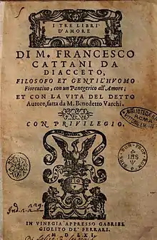1. 1 2 Benedetto Varchi (1561). I tre libri d'Amore di M. Francesco Cattani da Diacceto, filosofo et gentil'hvomo fiorentino, con un Panegerico all'Amore; et con la Vita del detto autore, fatta da M. Benedetto Varchi (in Italian). In Vinegia: appresso Gabriel Giolito de' Ferrari.