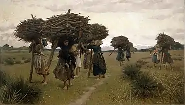 He is best known for rural scenes of grape harvesting. Among his paintings are Goldoni visits Rousseau (1869); dal Sola alle Renaiole, dalle Macchiaiole di San Rossore alla Vendemmia allegra; l'Autunno, and la Vendemmia (1885); il Tempo di Vendemmia (1886); il Ritornando dalla vendemmia (1889); nel Vendemmia allegra (1908). In 1872 he painted l'Acqua; a year later he painted La Portatrice d'acqua, depicting a young female water porter in the countryside. He also painted la Gioventù (1891), in Tuscan Peasant (1892), Tramonto a Castiglioncello; Sera di luna, Pesca a sciabica, Venditrice di arselle, and Renaioli. In 1909 he presented at Venice: Florentine Harmonies, four vedute of Florence.[2]