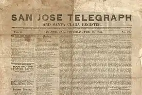In 1853, Murdoch took over the Santa Clara Register from John C. Emerson and changed its name to the San Jose Telegraph.[1] The Telegraph offices were above a saloon between First and Market Street in San Jose.[12] Previously a Whig newspaper, the Telegraph became Republican in 1854, in opposition to the Kansas–Nebraska Act.[13]