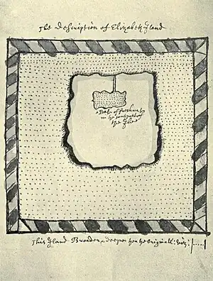 In September 1578, Drake's own ship, the Golden Hind, passed the Strait of Magellan amid storms, and Fletcher recorded that the ship was driven to the "utmost island of Terra Incognita".[4] He made a map of "Elizabeth Iland" (pictured),[5] which Fletcher and Drake claimed for England, naming it Elizabeth Island.[6]