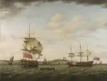![]() Francis Holman Painting of Commodore James in HCS Protector, with HCS Revenge and the HCS grab Bombay in the bay off the Suvarnadug fort at Gheriah, India, April 1755 | |