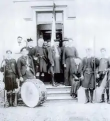 On the steps of Ard Righ c. 1914: Bigger (centre), Roger Casement (back row, left) and what may be a west Belfast troop of Na Fianna Éireann