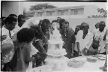 Chico Mendes' marriage party in Ziguinchor, Senegal with Luís Cabral to the right of the cake, 1973