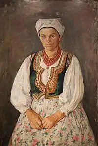 Wyspiański invited Mr. and Mrs. Ptak to the premiere show of The Wedding in the Kraków Municipal Theatre.[1] Author of the play was particularly interested in the opinion of Mrs. Marcjanna Ptak, whom he “valued for practical peasant reason”.[4] A columnist, literary critic and wife of the then-director of the Municipal Theatre Lucyna Kotarbińska recalled: “Wyspiański wanted to check what impression would The Wedding make on the countrywoman who doesn't have any closer contact with our artistic and literary world. We have agreed that, following his wishes, we will invite a peasant from Tonie, near Kraków, Mr. Ptak, with his wife. Mr. Ptak was a wise peasant. Deputy. Editor of the magazine. The only one eager to help to make decorations during ceremonies. Indeed he made the Jew move out from the tavern in the village, but he took the tavern himself, and his wife traded well at the canteen. Apart from that, she was also very strict. So we go to them, on Sunday afternoon, with our sister Teofila Kotarbińska, who was staying at our place, and Włodzimierz Tetmajer. The host welcomed us like Piast. In a white sukmana with a loaf of bread, putting a jar of honey, which we liked so much that we forgot about the hour. And here's the show and we have to get on the train we just hear whistling. We run as if we were shot from a sling, as if we all had wings, trotting through the fields, with waving hands, handkerchiefs and screams, that the train stands in the middle of nowhere and takes us to Kraków. Well, that's when we invited Mr. and Mrs. Ptak to the lodge, in which Mrs. Ptak was the main subject of our observation. She behaved quite indifferently to the whole. She only reacted to one thing, namely, when in response to a long epistle of The Poet, Czepiec says: – Take a simple wife: much bliss, little cost. – If someone takes a simple wife, the costs are smaller, it's true, but that it gives much bliss – I do not believe it, judged Mrs. Ptak.”[5]